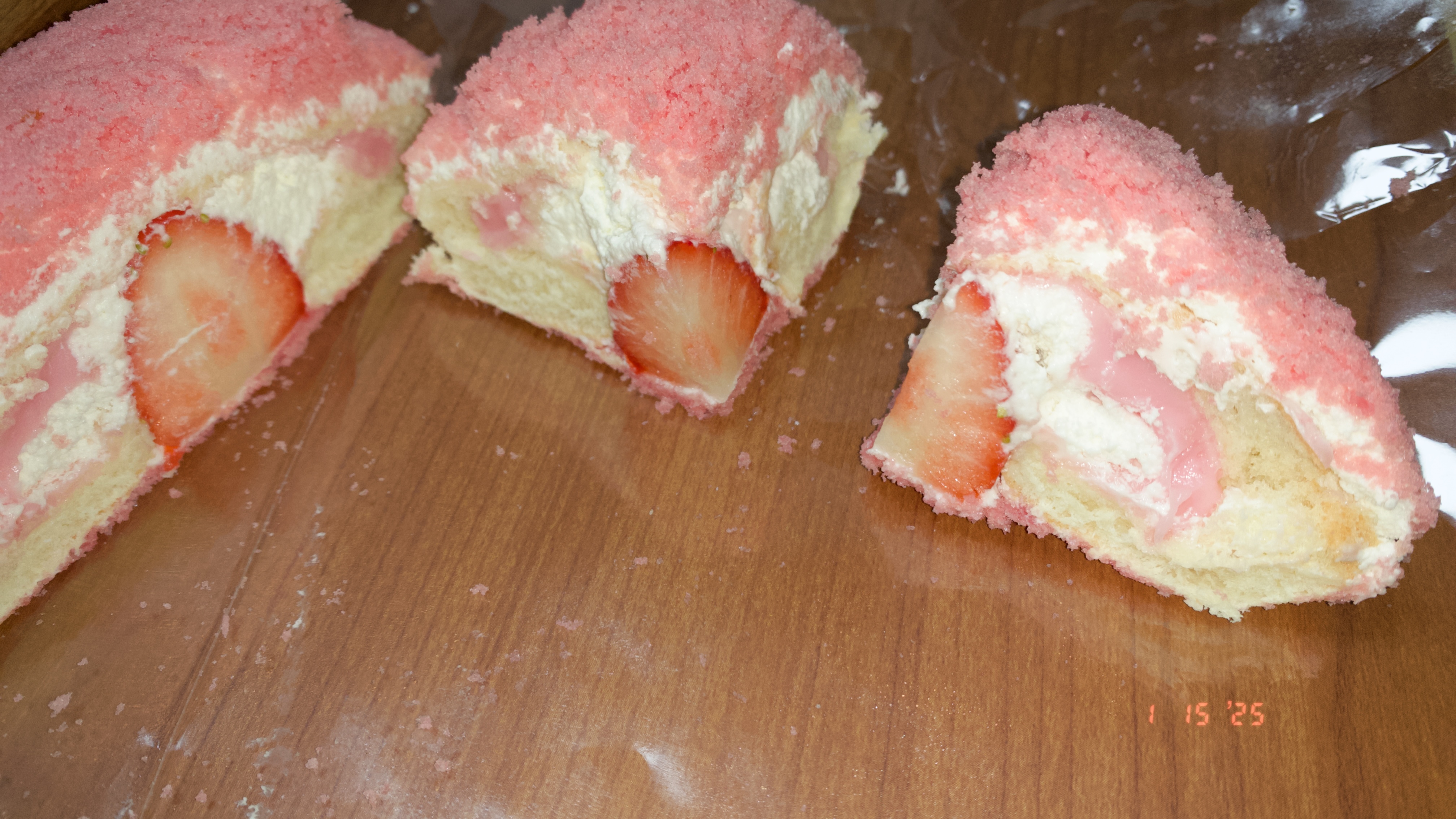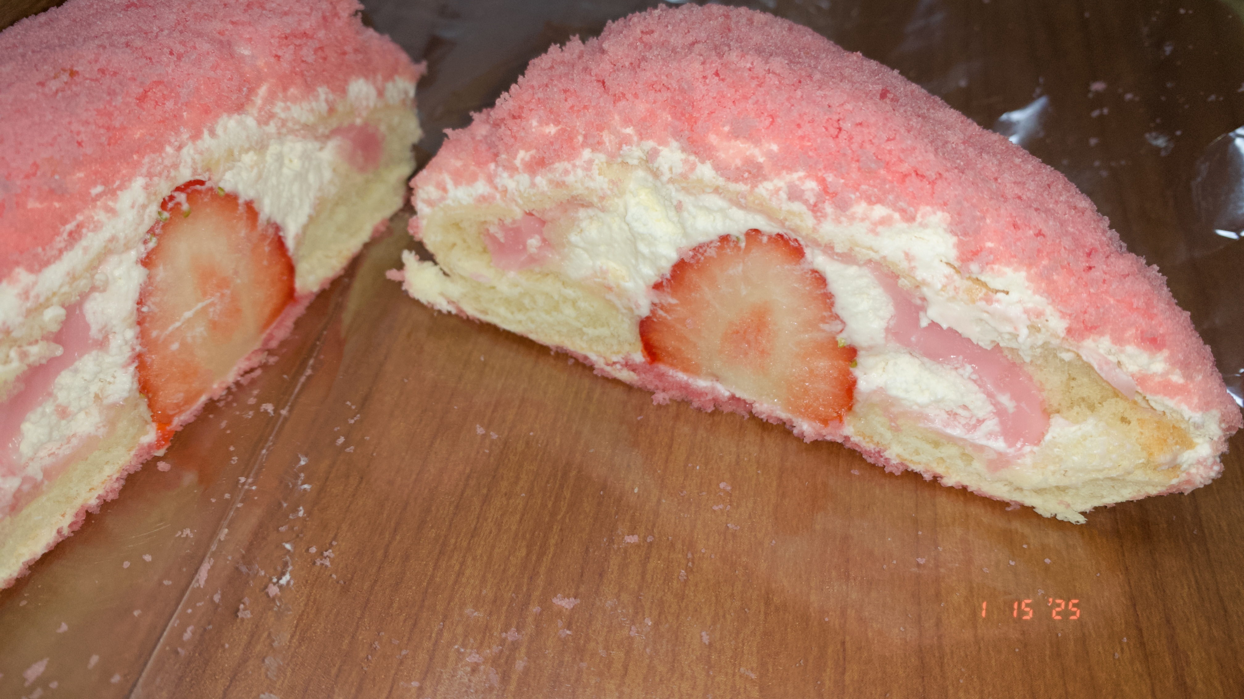 뽀얀 생크림과 분홍색의 딸기 크림??(딸기 커스타드라네요-) 이 들어있습니다.